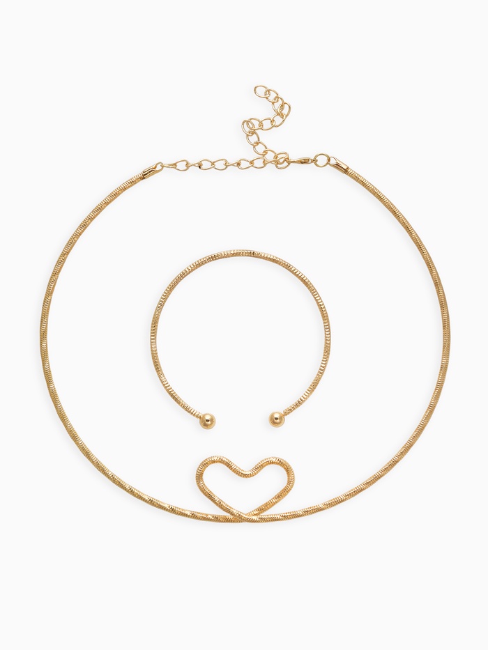 Изысканный комплект, включающий чокер и браслет в золотистом исполнении, станет эффектным акцентом вашего образа. Лаконичные формы в виде сердца без вставок подчёркивают утончённость и современный стиль, позволяя легко сочетать украшения с разной одеждой — от повседневных ансамблей до вечерних выходов.