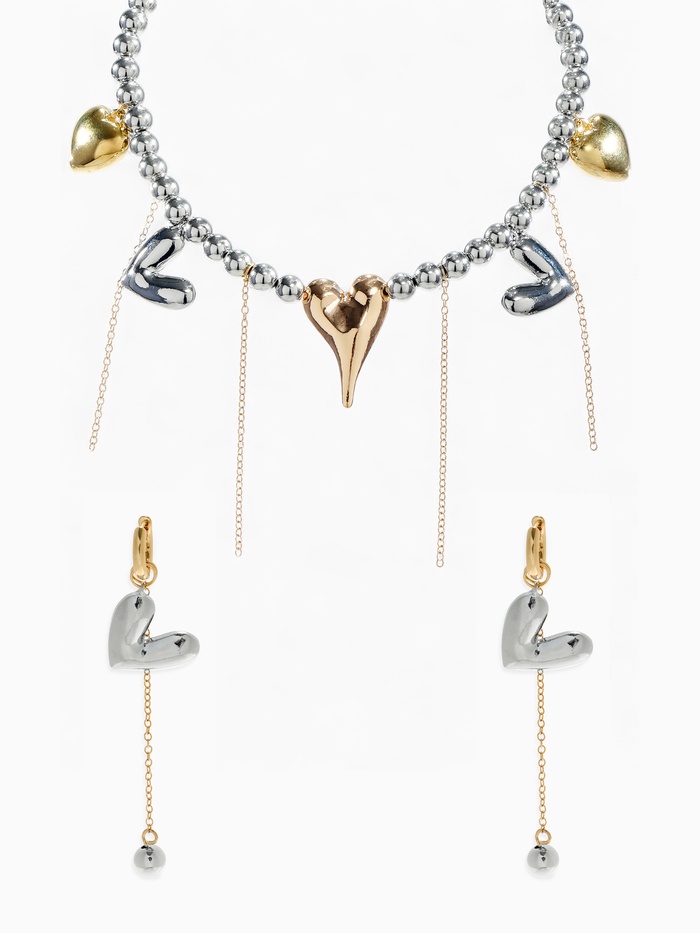 Этот комплект из двух изысканных украшений сочетает в себе романтику и современный стиль, играя благородными золотистыми и серебристыми оттенками. Колье и серьги с темой сердца — символом любви и тепла — позволяют воплотить в повседневном образе трепетные чувства и подчеркнуть индивидуальность.