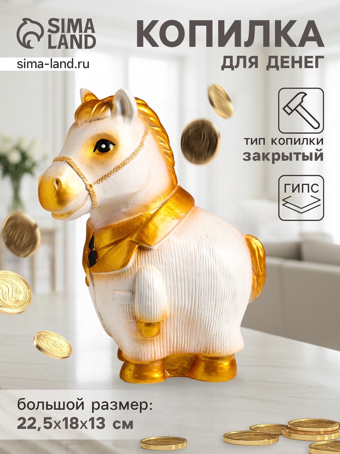 Эта гипсовая копилка в виде лошади станет элегантным и практичным спутником на пути к вашим финансовым целям. Её классический белый цвет с золотым покрытием делает её не просто ёмкостью для накоплений, а стильным элементом декора, который впишется в любой интерьер.