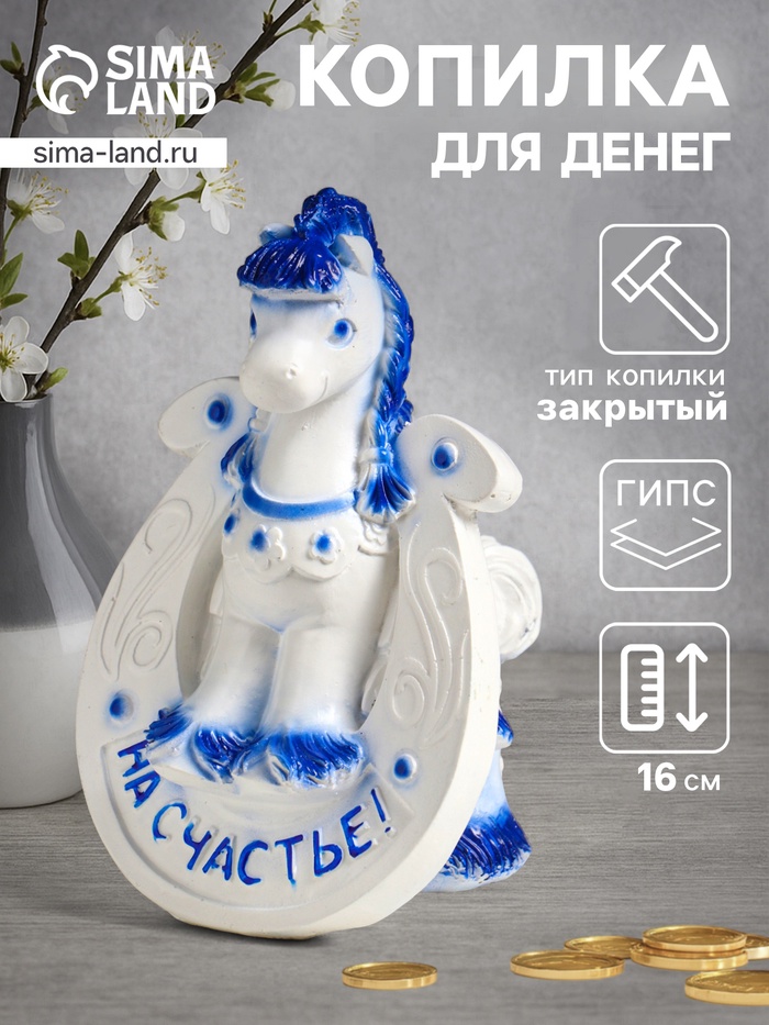 Эта бело-голубая гипсовая копилка в виде лошади станет особым подарком, который принесёт в дом ощущение стабильности и удачи. Фигурка животного с изящной подковой — это не просто ёмкость для хранения сбережений, а элегантный акцент в интерьере, напоминающий о важности заботы о будущем.