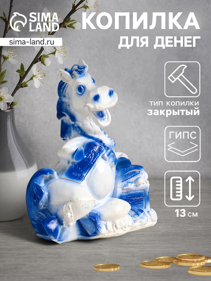Эта бело-голубая гипсовая лошадь станет не просто копилкой, а красивым талисманом, который поможет собрать средства на важную цель. Фигурка с сундуком монет напоминает о мудрости и бережливости, превращая процесс накопления в приятный ритуал.