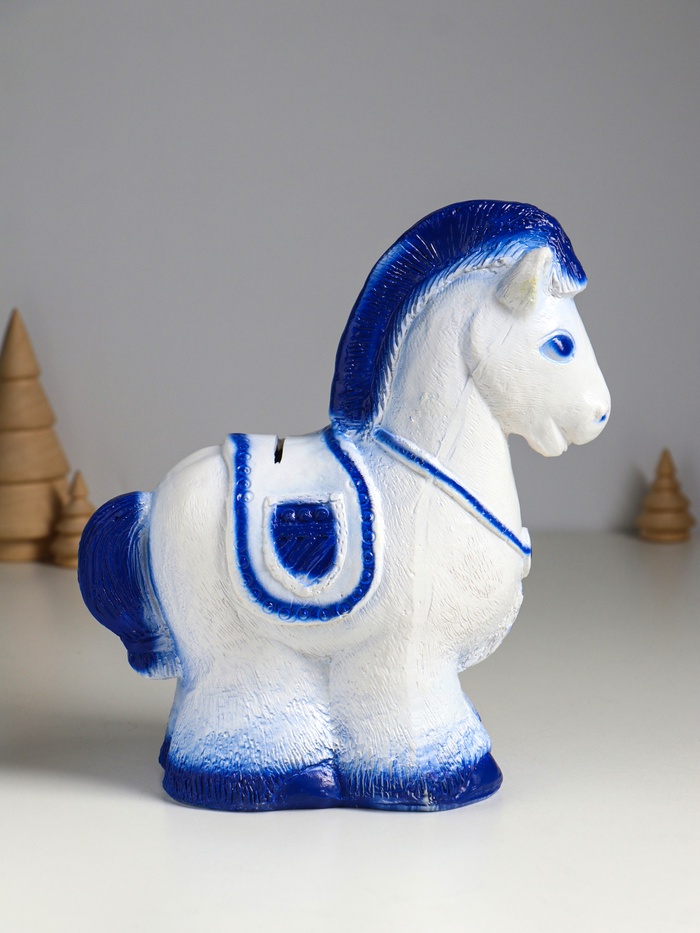 Эта бело-голубая гипсовая копилка в виде лошади станет не просто украшением интерьера, но и верным помощником в достижении ваших финансовых целей. Изящная фигурка пони, выполненная в спокойных пастельных тонах, привнесёт в дом атмосферу спокойствия и гармонии, напоминая о мудрой привычке откладывать на важные мечты.