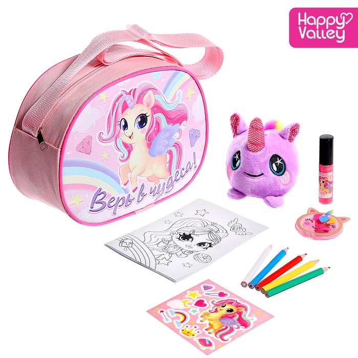 Ваша принцесса любит играть и модничать? Тогда от этого набора она будет в восторге, ведь в нём есть мягкая игрушка, детская косметика, наклейки и раскраска с карандашами! В комплект также входит красочная сумка.