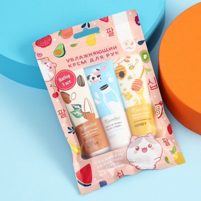 В набор входят увлажняющие крема: Крем для рук «Молоко» 30 мл, Крем для рук «Мёд» 30 мл, Крем для рук «Масло ши» 30 мл.