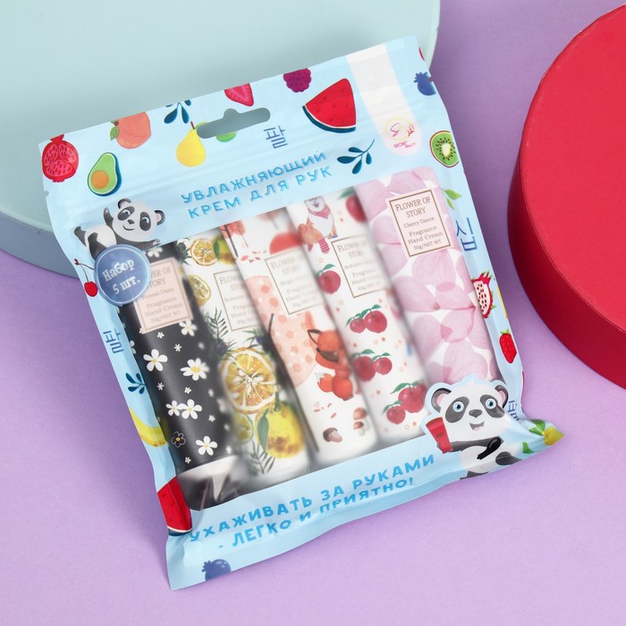 В набор входят увлажняющие крема: Крем для рук «Маракуя, чёрная смородина, пион» 30 мл, Крем для рук «Жасмин, фрукты, ваниль» 30 мл, Крем для рук «Фрезия, мандарин, мускус» 30 мл, Крем для рук «Яблоко, роза, ландыш» 30 мл, Крем для рук «Цветы, фрукты, янтарь» 30 мл.
