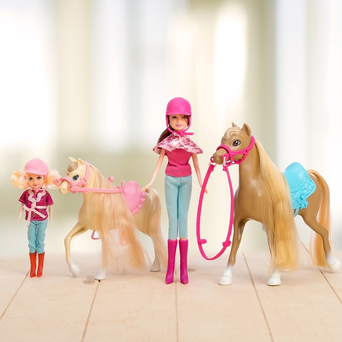 Животные выглядят как настоящие. У них есть седло, узда, повод и пышная длинная грива. В комплекте кукла-мамочка и кукла-малышка с длинными волосами. Ребёнок приберёт локоны и сделает самые красивые причёски. Куколки одеты в форму для езды верхом.