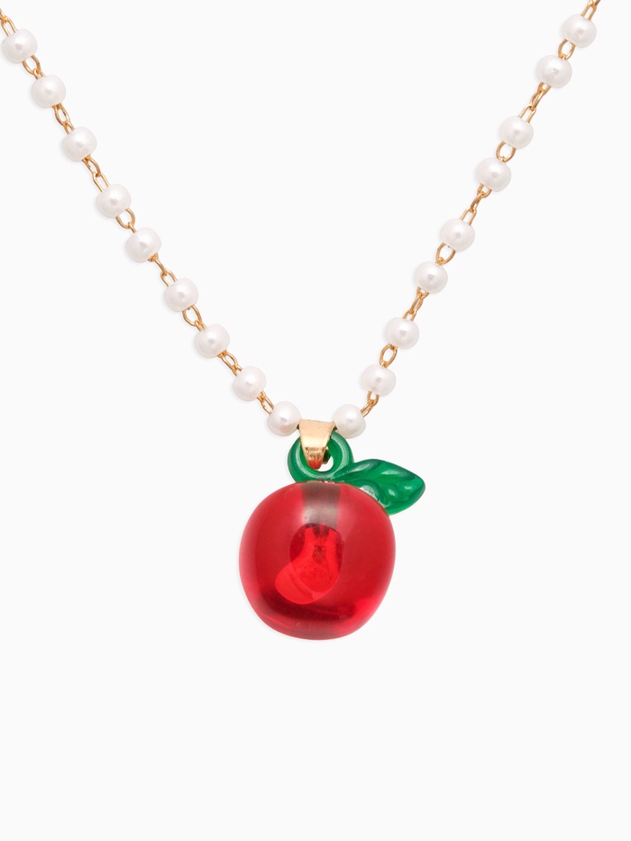 Центральная часть кулона выполнена из пластика, точно имитирующего яблоко, покрытая сверху тонким слоем металла, придающим изделию блеск и благородство. Диаметр яблок достигает около 1 см, а сама цепочка снабжена маленькими жемчужинами, выполняющими роль дорожки и дополнительно украшающими композицию.