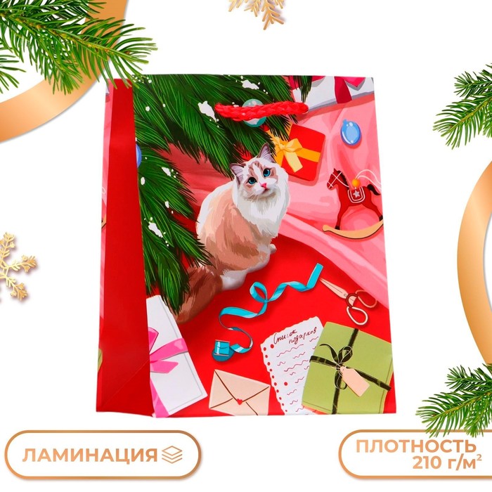 Новогодний подарочный пакет, выполненный из высококачественного материала с плотностью 210 г/м². Этот пакет идеально подходит для упаковки подарков на Новый год и создания праздничной атмосферы.