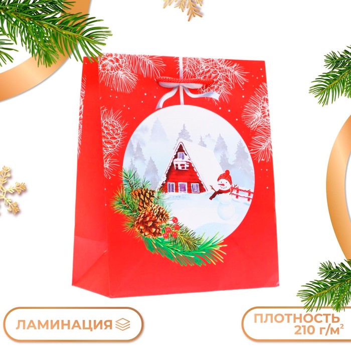 Пакет подарочный новогодний изготовлен из прочного и качественного материала, включая картон, текстиль и высококачественную бумагу.