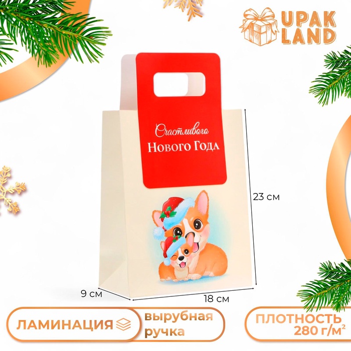 Подарочный пакет с вырубной ручкой, размером 18 х 23 х 9 см, с новогодним дизайном – это стильное и удобное решение для упаковки праздничных подарков.