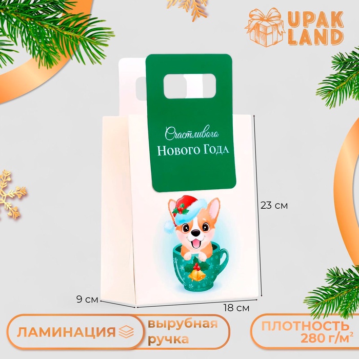 Подарочный пакет с вырубной ручкой, размером 18 х 23 х 9 см, с новогодним дизайном – это стильное и удобное решение для упаковки праздничных подарков.