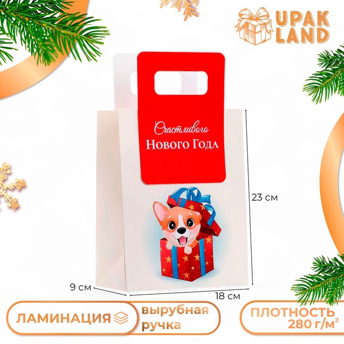 Подарочный пакет с вырубной ручкой, размером 18 х 23 х 9 см, с новогодним дизайном – это стильное и удобное решение для упаковки праздничных подарков.