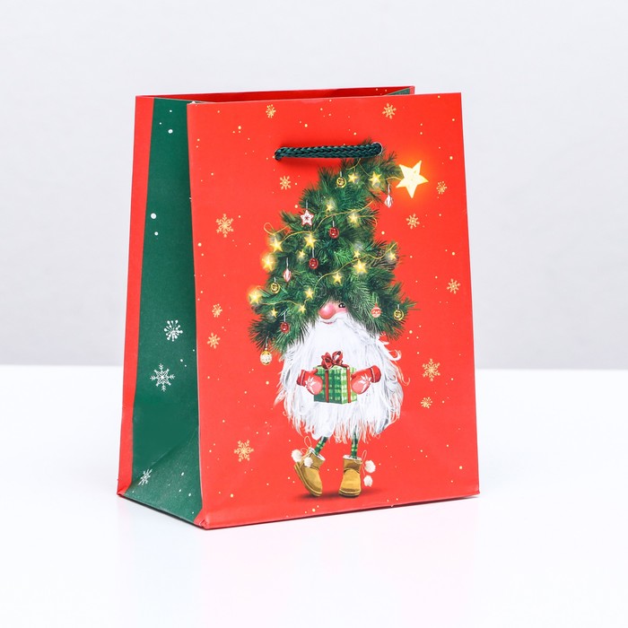Новогодний подарочный пакет с ярким, красочным рисунком создаст праздничное настроение.