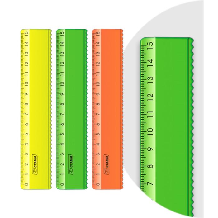 Линейка 15 см с ровной чёткой миллиметровой шкалой и волнистым краем.