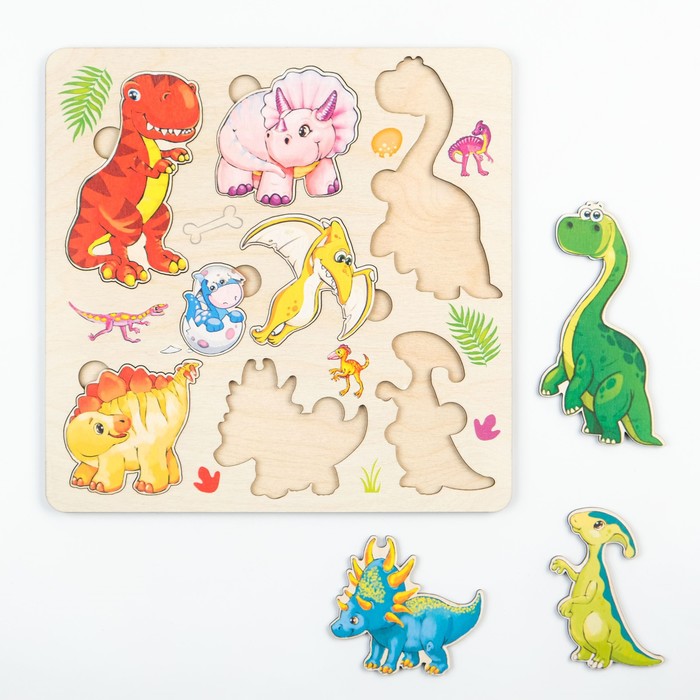 Игрушка представляет собой планшет с 8 отверстиями и 8 фигурками в виде динозавров. Задача ребенка – найти каждой фигурке свое место на планшете.