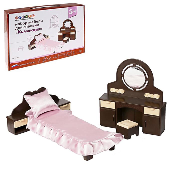 Спальня «Конфетти» состоит из кровати, туалетного столика и пуфа для куколки до 20 см. Ящики прикроватной тумбы и стола выдвигаются.