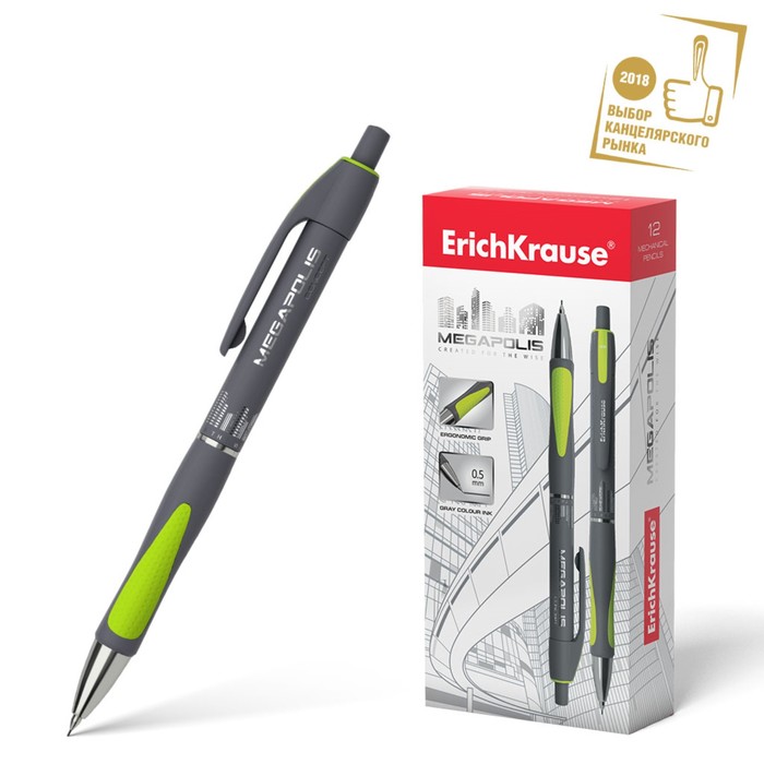 Механический карандаш с металлическим наконечником и убирающейся цангой. Карандаш имеет круглый глянцевый корпус с эргономичной грип-зоной, оснащенной двумя резиновыми неоновыми вставками. Твердость HB. Диаметр грифеля - 0.5 мм. Модель MEGAPOLIS® Concept имеет узнаваемую запатентованную форму, обладает великолепной эргономикой и стала одним из бестселлеров в ассортименте механических карандашей ErichKrause® более чем в пятидесяти странах мира.