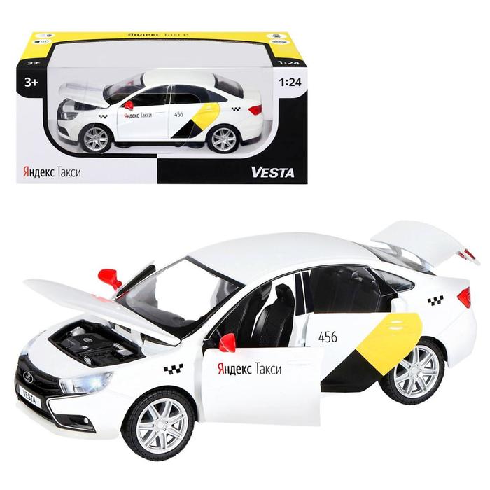Яндекс Go — один из самых популярных сервисов такси в России и за её пределами. Металлическая лицензионная модель автомобиля такси LADA Vesta качественно окрашена и имеет инерционный механизм. Колёса с резиновыми покрышками, зеркала, дворники, фирменная раскраска Яндекс Go с шашечками и индивидуальным номером — всё как у настоящего автомобиля.