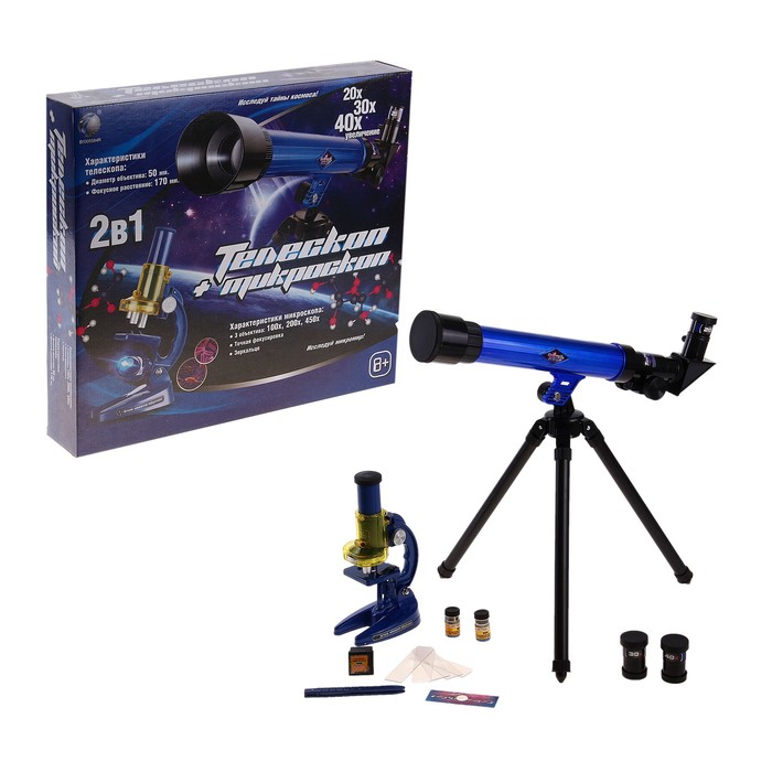 Набор телескоп и микроскоп 2 в 1: предметное стекло, пластиковая емкость, пинцет, пробирки, наклейки - это увлекательная игрушка, которая не оставит равнодушным Вашего юного исследователя, позволит открыть тайны космоса и изучить микромир.