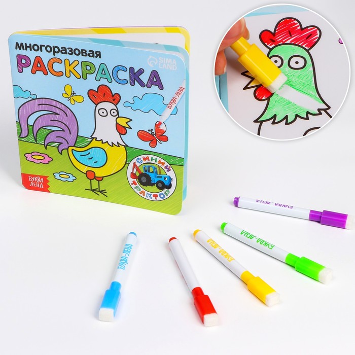 Многоразовая раскраска — настоящая находка для маленьких любителей раскрашивать! К раскраскам прилагается 5 цветных маркеров, которые легко удаляются со страниц при необходимости. Поэтому ребёнок сможет раскрашивать картинки с любимыми героями неограниченное количество раз. Ведь всё можно стереть специальной губкой на колпачке маркера и начать раскрашивать сначала!