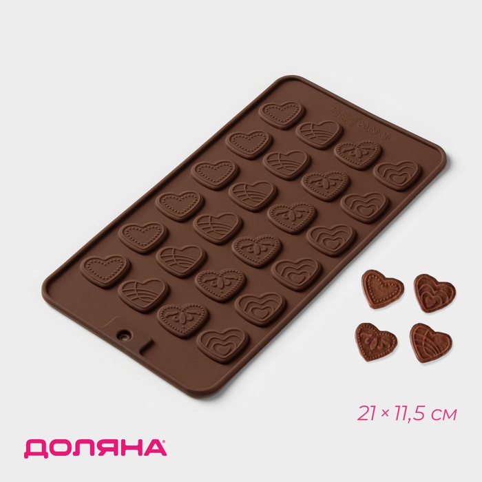 Силиконовая форма «Сердечки» — практичное решение для массового производства нежных шоколадных или желейных десертов. Двадцать четыре ячейки позволяют за один заход создать целую коллекцию мини-подарков, идеальных для Дня святого Валентина, свадебных угощений или романтического сюрприза. Нейтральный коричневый оттенок не отвлекает от деталей, а прямоугольный формат легко размещается в морозильной камере или на подносе.