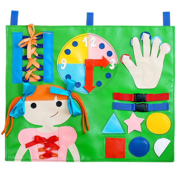 В процессе игры ребёнок научится определять время по часам, шнуровать, завязывать банты, плести косички и застёгивать замки.
