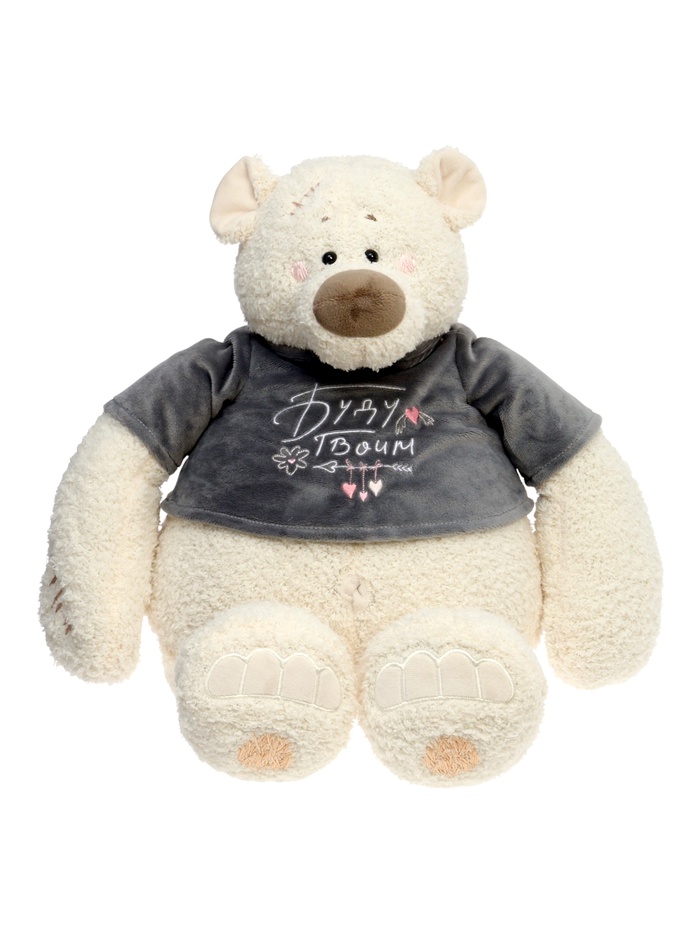 Мягкая игрушка «Медведь Тато в графитовой майке» — уютный плюшевый медвежонок с мягким, слегка винтажным характером. Светлый мех, вышитые детали и графитовая майка с надписью создают образ доброго, немного задумчивого героя, который сразу вызывает симпатию.