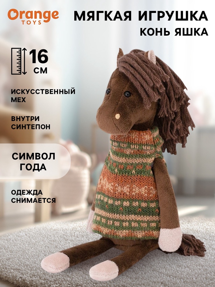 Мягкий конь Яшка — это очаровательный персонаж, который станет любимым другом для вашего ребёнка или стильным аксессуаром в интерьере. Его коричневый мех и модная одежда создают атмосферу уюта, а компактный размер делает его идеальным спутником для игр дома, в детском саду или даже в путешествии.