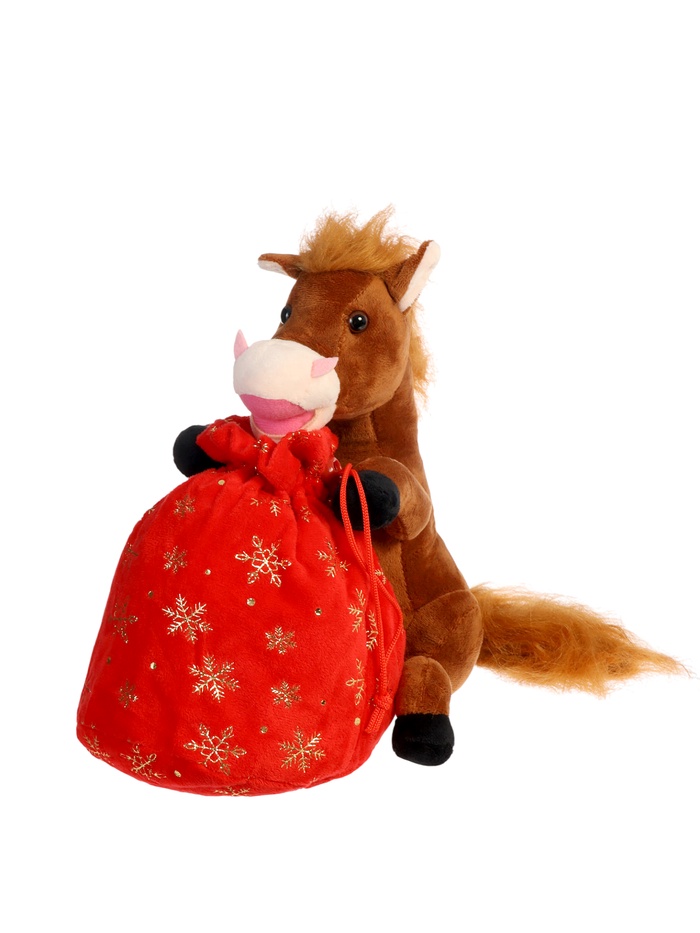 Мягкая лошадка с мешочком-конфетницей — это очаровательный аксессуар, который украсит дом и поднимет настроение взрослым и детям. Её тёплый образ с красным мешком делает игрушку ярким элементом декора и милым компаньоном для любого случая.