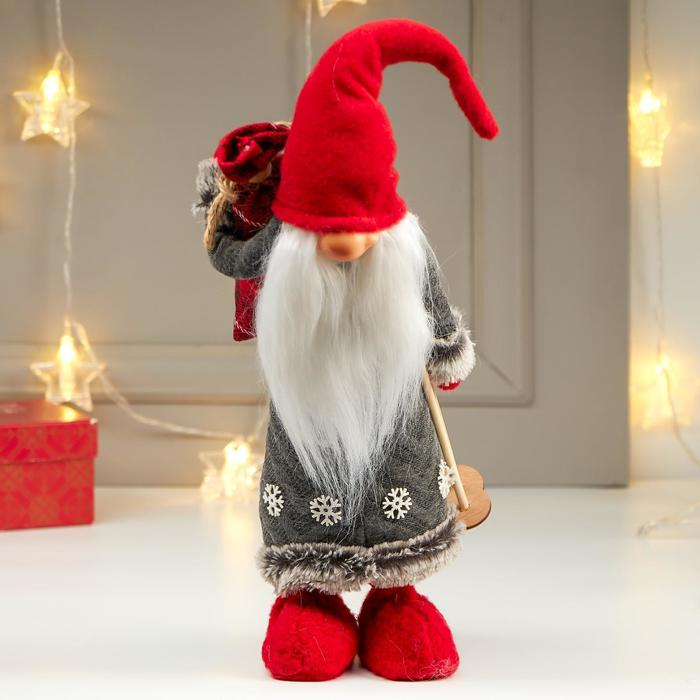Кукла интерьерная "Дедушка Мороз в серой шубе и красном колпаке-шапке" 55х15х16 см