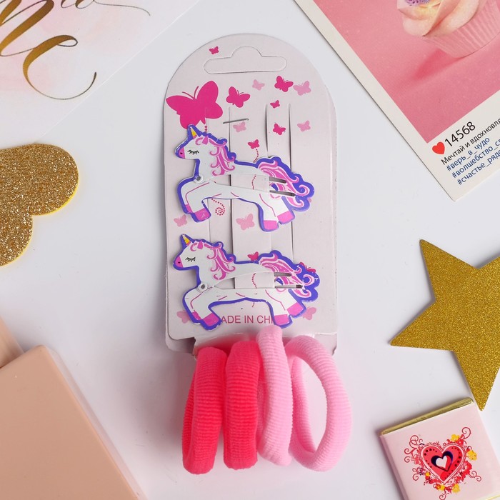 Набор для волос "Беверли" ( 4 резинки, 2 невидимки) единороги 5 см, микс