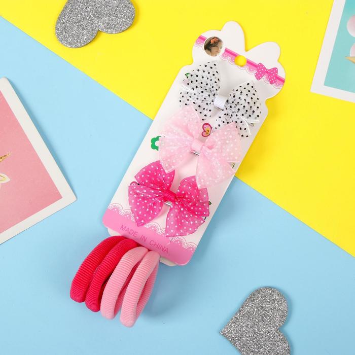 Набор для волос "Лада" (4 резинки, 3 зажима) горошек, бело-розовый