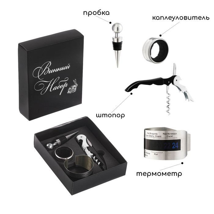 | Составляющие набора | Штопор, Манжета-каплеуловитель, Пробка для бутылки, Термометр |