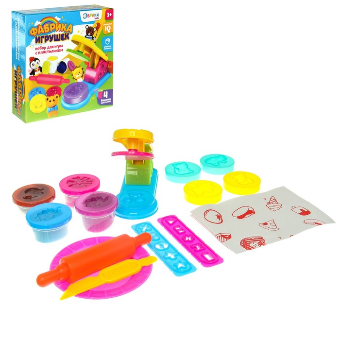 Набор для творчества «Фабрика игрушек» — это комплект разнообразных предметов для лепки из пластилина. В нём можно найти несколько интересных инструментов и формочек, а также баночек с разноцветной массой для лепки.