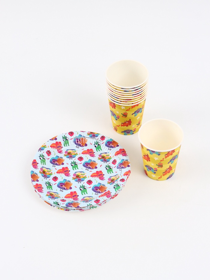 Включает: 10 стаканов и 10 тарелок. Яркий дизайн с забавными героями поднимает настроение на празднике или детском мероприятии. Изготовлен из безопасного картона — подходит для холодных и тёплых напитков и лёгких закусок. Удобно брать в гости, на пикник или в детский сад.