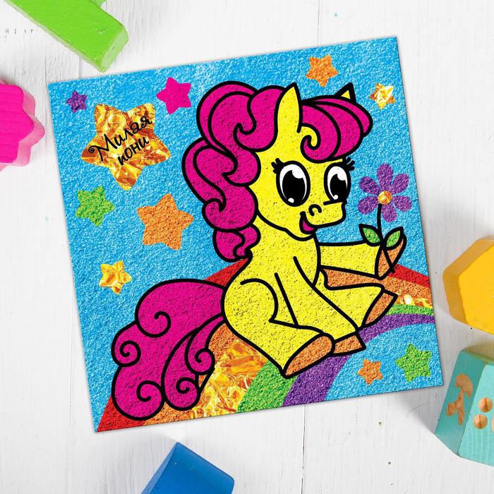 Необходимо отделить защитный слой с одной детали картинки и засыпать основу песком, блёстками нужного цвета либо нанести фольгу и удалить излишки. Так, шаг за шагом ваш малыш создаст удивительный шедевр.
