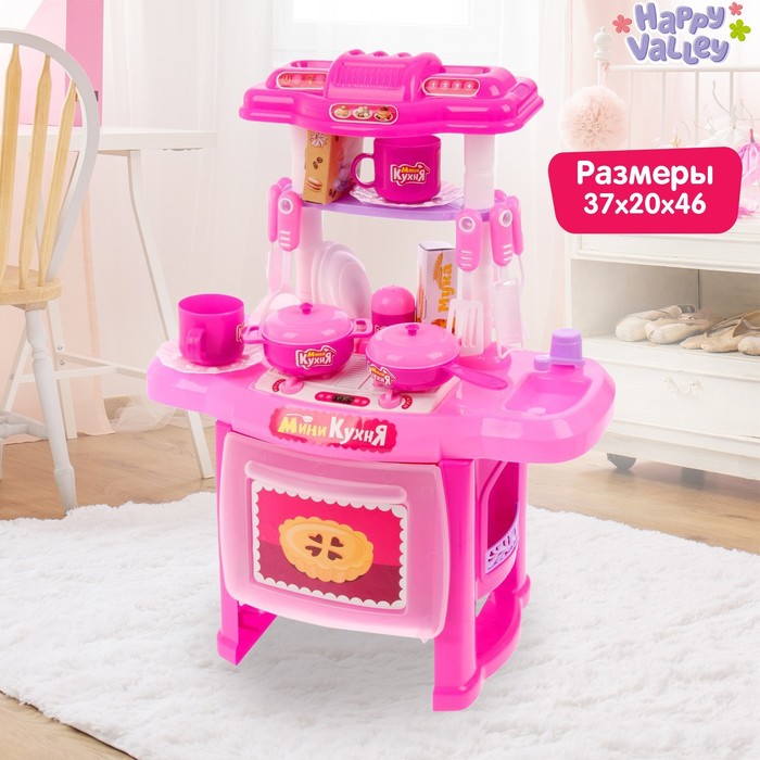 Мини-кухня торговой марки Happy Valley — это яркий игровой модуль для первых кулинарных экспериментов ребёнка. Уголок состоит из рабочей зоны, варочной поверхности с 2 конфорками, раковины с краном, полочек для хранения утвари и духового шкафа с открывающейся дверцей.