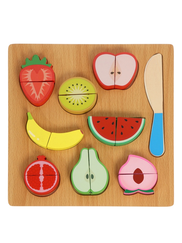 Натуральный материал:предметы выполнены из дерева — устойчивого, тактильно приятного и безопасного материала с аккуратной обработкой.- Удобная форма для маленьких рук: фрукты легко держать, перекладывать, сортировать и включать в игровые действия. Ребёнок чувствует уверенность и самостоятельность.