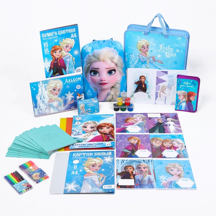 Составляющие набора | Тетрадь, Белый картон, Папка, Пенал, Альбом, Ручка, Мешок для обуви, Краски, Фломастеры, Цветной картон, Цветная бумага |