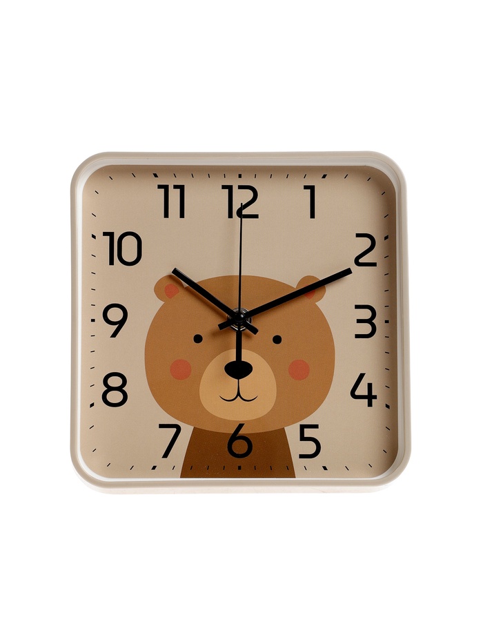 Квадратные настенные часы размером 19×19 см с изображением милого медвежонка на бежевом фоне воплощают нежность и игривость, идеально подходя для детских комнат или игровых зон. Кварцевый механизм обеспечивает плавный ход стрелок, а арабские цифры на циферблате делают отсчёт времени интуитивно понятным, помогая развивать чувство времени у малышей с раннего возраста.