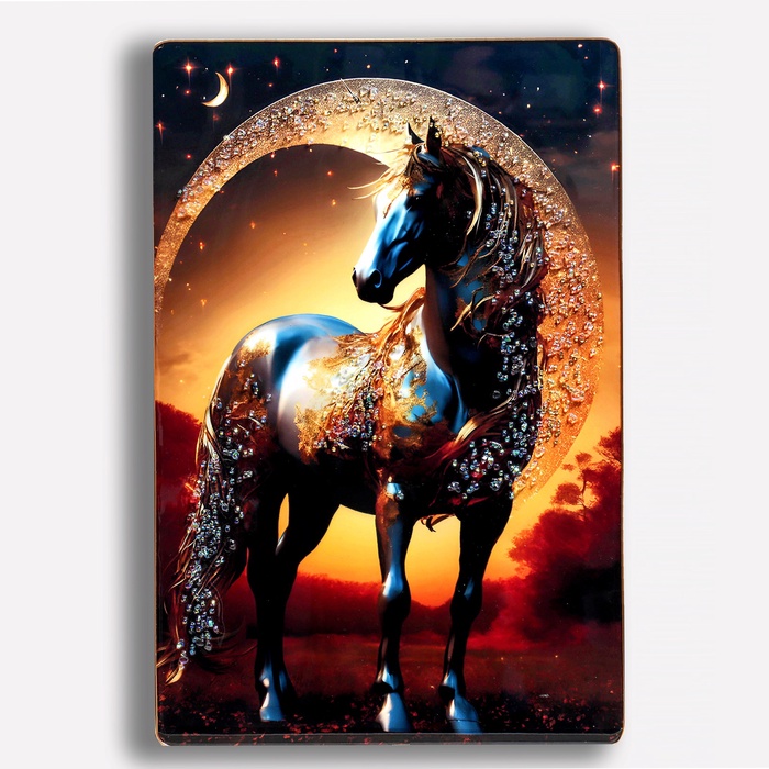 - Художественное исполнение: Картина написана акриловыми красками, они дают насыщенные, глубокие цвета и четкие линии. Техника позволяет добиться эффекта свечения — лунная дорога и силуэт коня выглядят объемно и реалистично.