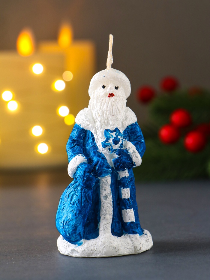 - Выразительный дизайн: Фигура традиционного Деда Мороза с резными деталями и глубоким синим цветом добавляет композиции визуальный объем. Свеча выглядит как цельная скульптура, создающая настроение даже в негорящем состоянии.