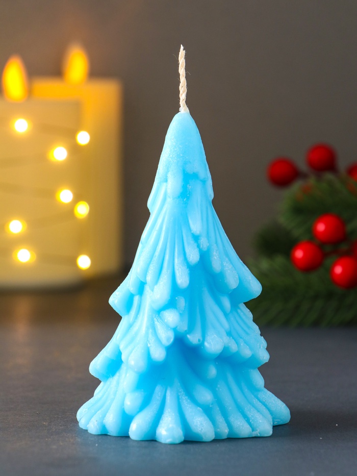 - Нежный зимний оттенок: Спокойный голубой цвет свечи напоминает о первых сумерках зимнего вечера или о сверкающем насте. Этот холодный тон эффектно контрастирует с традиционными тёплыми тонами праздника, создавая стильный и современный образ.
