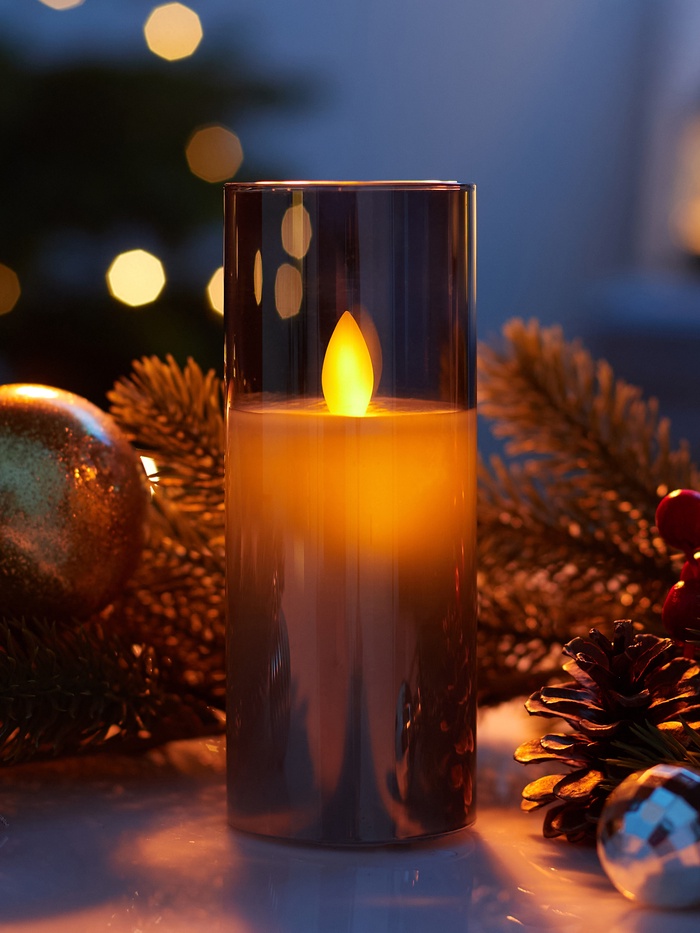 Серебристый оттенок этой светодиодной свечи в восковом стакане добавляет интерьеру современную элегантность и лёгкую нотку праздничного блеска. Компактные размеры — 14 × 5,5 см — позволяют гармонично разместить её на столе, полке или каминной полке, создавая атмосферу спокойствия и уюта.