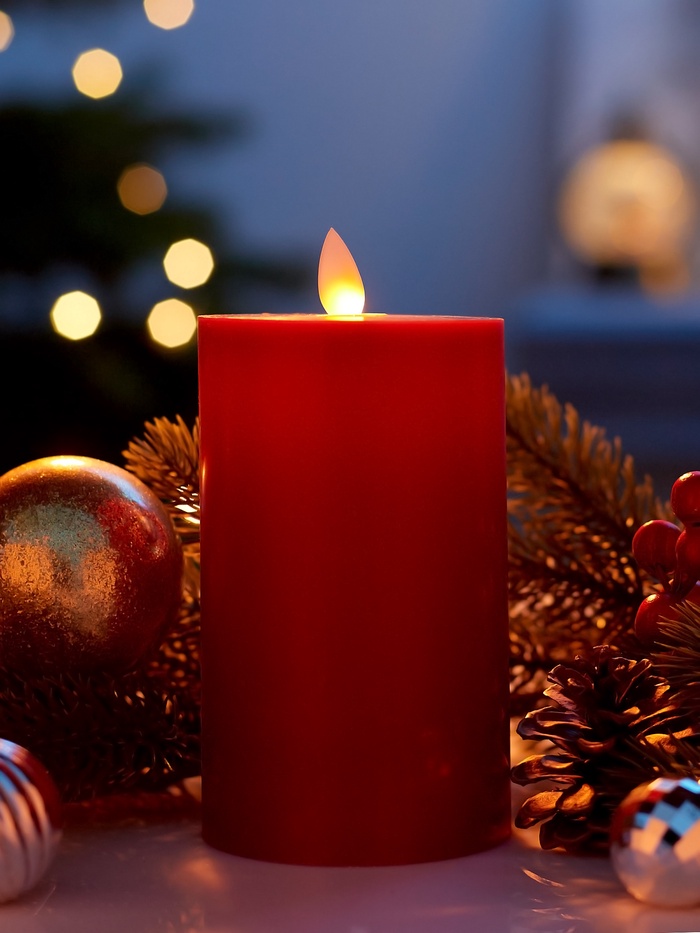 Глубокий красный оттенок этой восковой светодиодной свечи создаёт атмосферу тепла и уюта, идеально вписываясь в интерьер любого стиля. Её цилиндрическая форма высотой 15 см придаёт классическую элегантность, а тёплое белое свечение наполняет пространство мягким, расслабляющим светом.