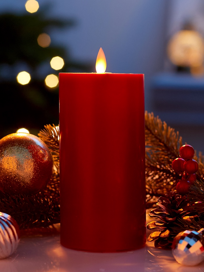 Глубокий красный оттенок этой восковой светодиодной свечи создаёт атмосферу тепла и уюта, идеально вписываясь в интерьер любого стиля. Её цилиндрическая форма высотой 17 см придаёт классическую элегантность, а тёплое белое свечение наполняет пространство мягким, расслабляющим светом.
