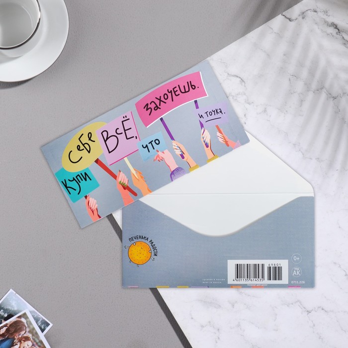 Конверт для денег "Купи все что захочешь" тиснение, таблички, 8,3х16,7 см