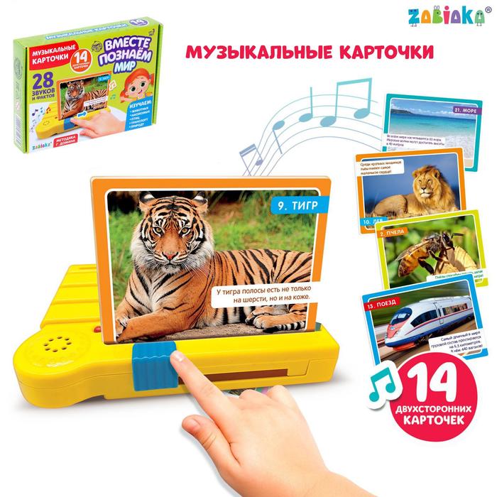 В набор входит 14 двухсторонних обучающих карточек. На них малыша ждёт 28 звуков и фактов.