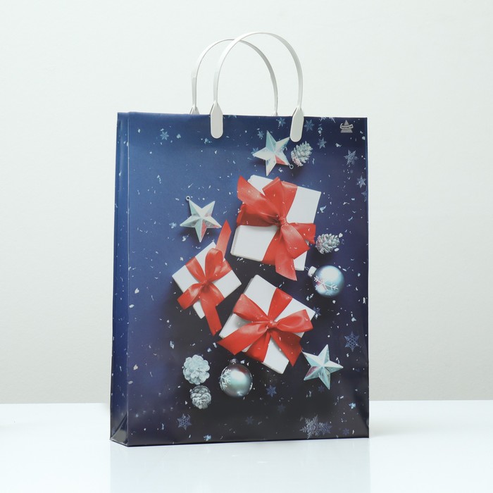 Новогодний подарочный пакет с ярким, красочным рисунком создаст праздничное настроение.