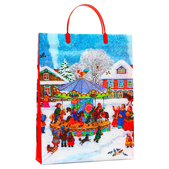 Праздничный дизайн с яркими новогодними элементами, такими как снежинки, ёлочные игрушки и зимние пейзажи, создаст особую атмосферу ожидания чуда и уюта. Удобные ручки-сумка обеспечивают комфорт при переноске, а вместительный размер позволяет легко упаковать и транспортировать даже крупные подарки.